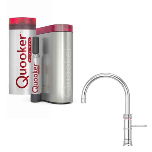 - Quooker PRO3 reservoir: Het PRO3-reservoir levert 3 liter kokend water en is uiterst geschikt wanneer je niet lang op warm leiding water hoeft te wachten en wanneer er geen keukenboiler in het keukenkastje staat. Het reservoir genereert het kokend water, waarnaast je de normale leidingen gebruikt voor de warm en koud water toevoer.